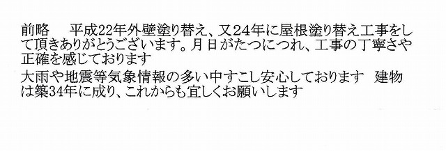 さて、先日3年前に外壁塗装を、昨年屋根塗装をさせていただきましたお客様より、ご感想を頂戴しました。